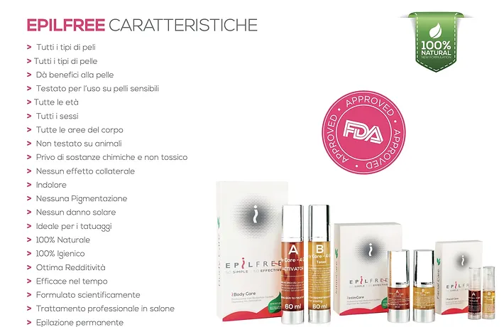 É un'epilazione nuova sul mercato. Grazie a due prodotti brevettati elimina la papilla dermica dei peli in fae anagen, è indicato in caso di tatuaggi e pelo chiari e/o bianchi.